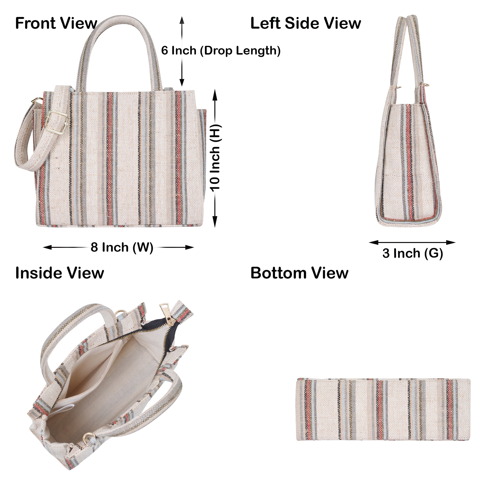 Spacious & Functional Design: With dimensions 10" (L) × 8" (H) × 3" (W)), it features one main zipper compartment, one inside zipper pocket, two open inner pockets, and one back zipper pocket — perfect for carrying books, cosmetics, a small bottle, and other daily essentials.